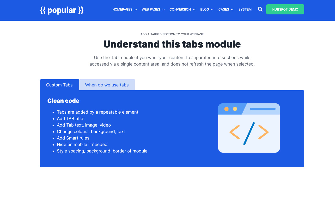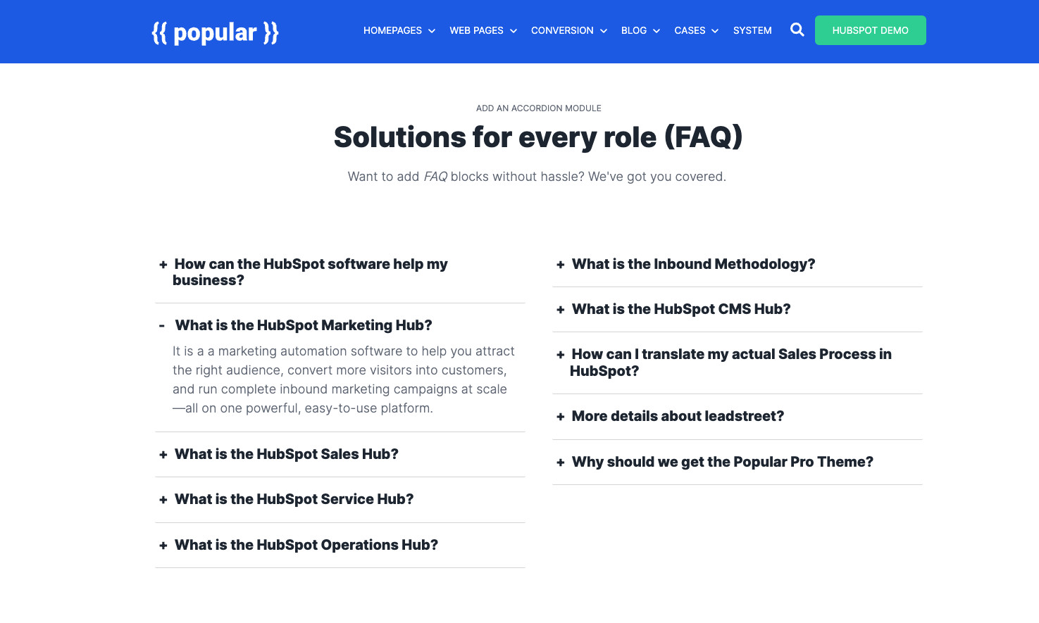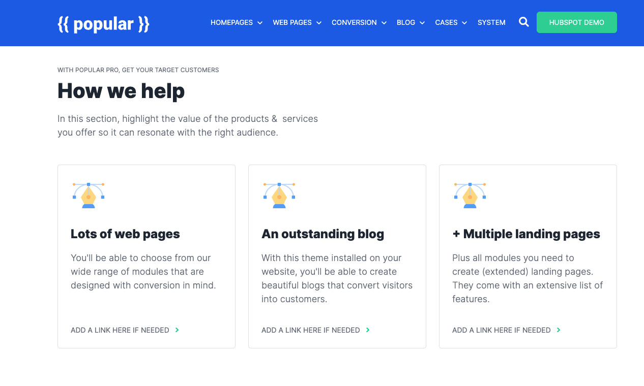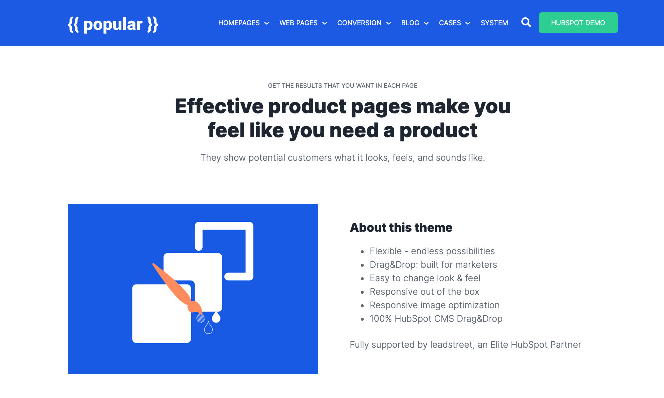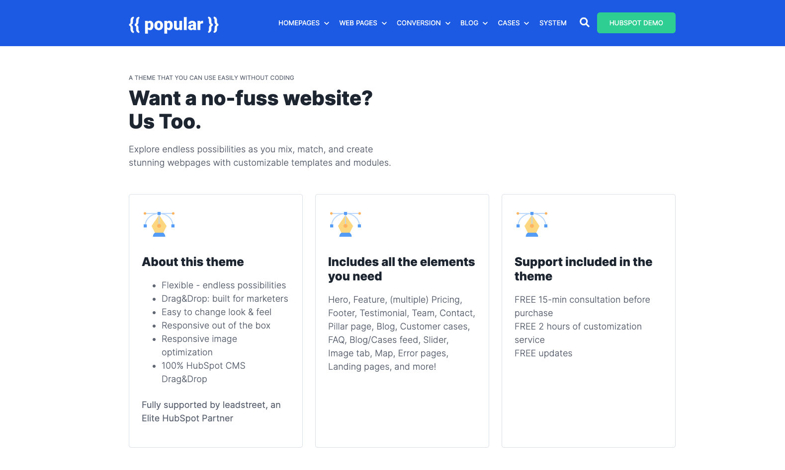 Build beautiful HubSpot-websites with over 40+ drag & drop modules. Ready to go or combine: building a HubSpot web page has never been easier.