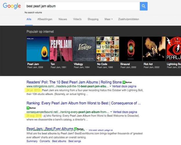 Hoe ga je dan na bij welke concrete onderwerpen dit volgens Google het geval is? Harde data zijn daar niet voor, maar je kunt wel een idee vormen. Doe een Google-zoekopdracht met een zoekterm en bekijk hoe oud de topresultaten ongeveer zijn. De gemiddelde leeftijd van de topresultaten is vaak een goede indicator.